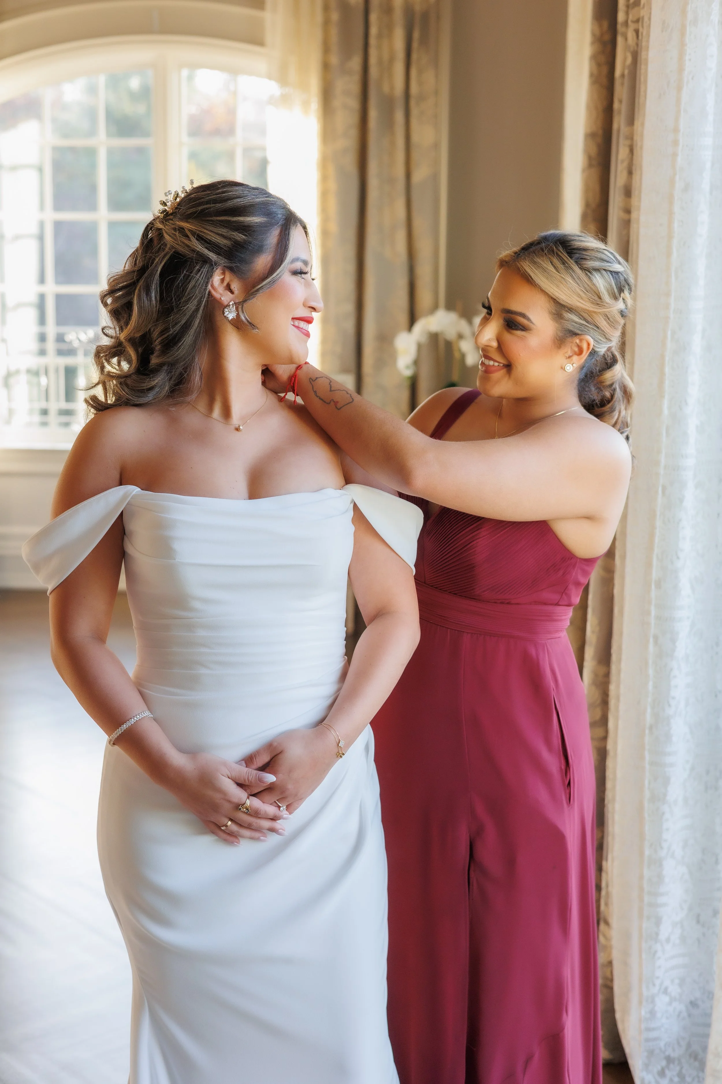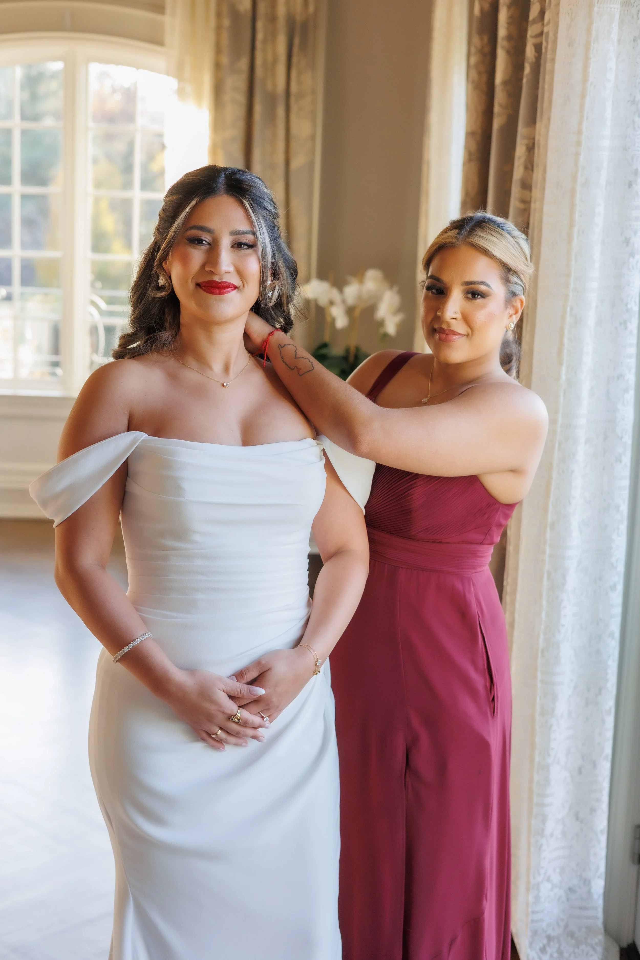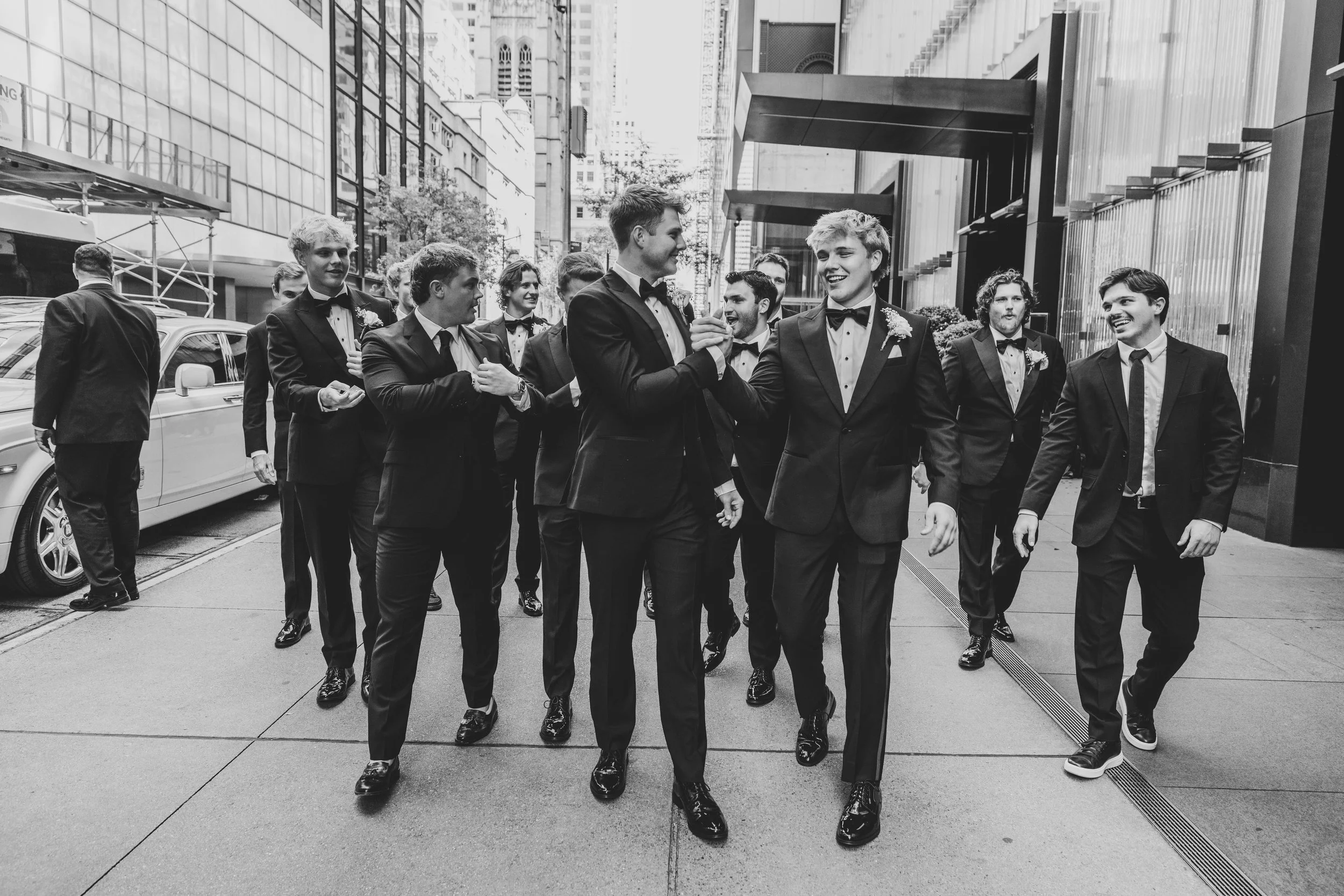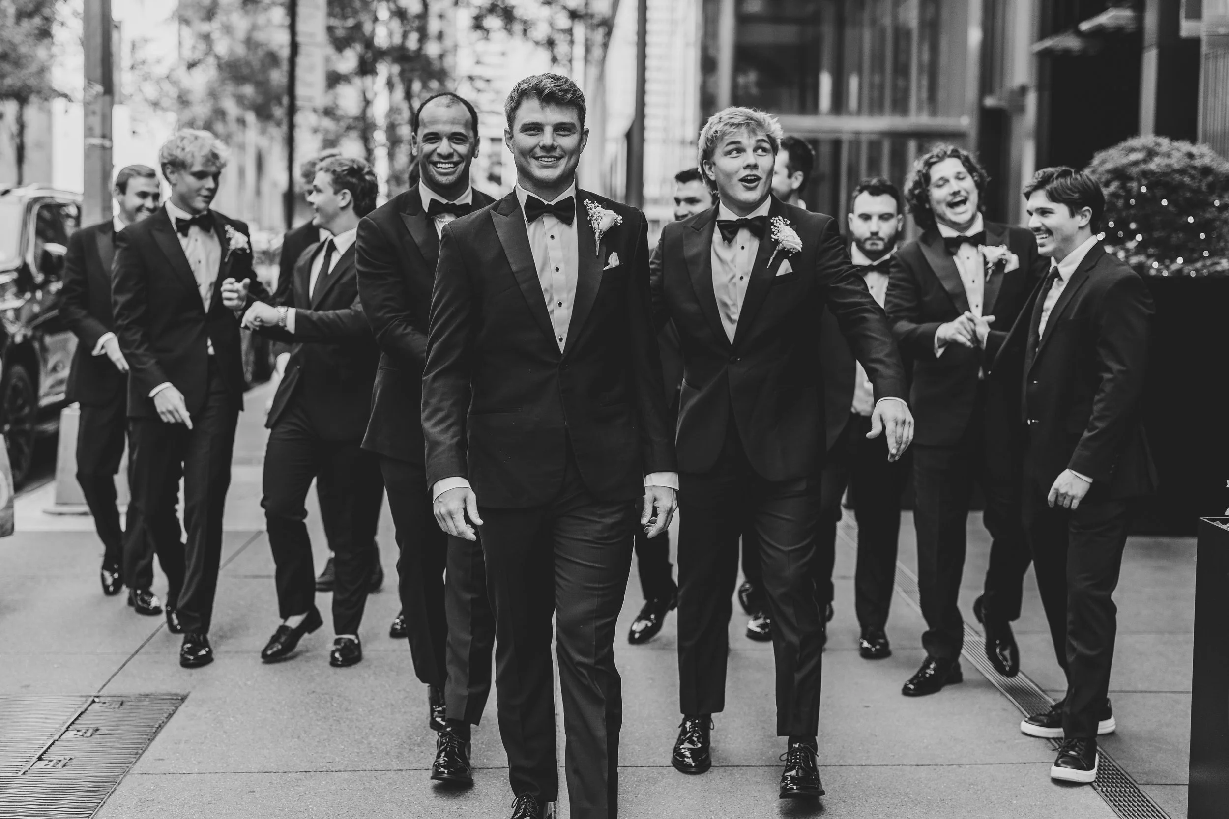 A man in a tuxedo and a woman in a strapless dress posing against a nighttime cityscape background